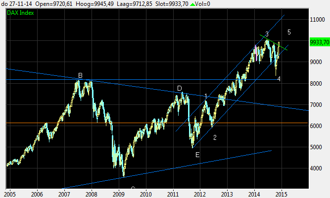 To begin with, the chart shows an impulse rise as from September 2011. After years of zigzagging the index rocketed through the descending trendline over the tops B and D (where the AEX still finds resistance as per my AEX analysis underneath). This impulse rise can be counted as 5 waves with wave 5 yet to be finished.