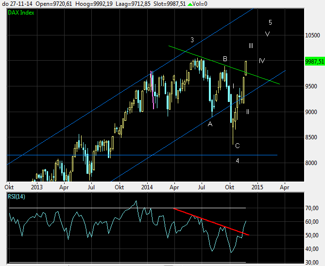 Zooming in I see that, compared with the CAC40 (see my analysis underneath) the DAX went through the descending green trendline of recent tops already. Looking at the RSI, I see that also there the red line of resistance has been crossed. A sign that current line is with relatively big power. Yet the all time high of june this year of around 10050 is waiting to be taken out soon. Looking at the chart, I expect this to happen coming weeks as the impulse started in 2011 is not yet finished. Wave 5, started in October, is now in subwave III with wave IV and V still te come.